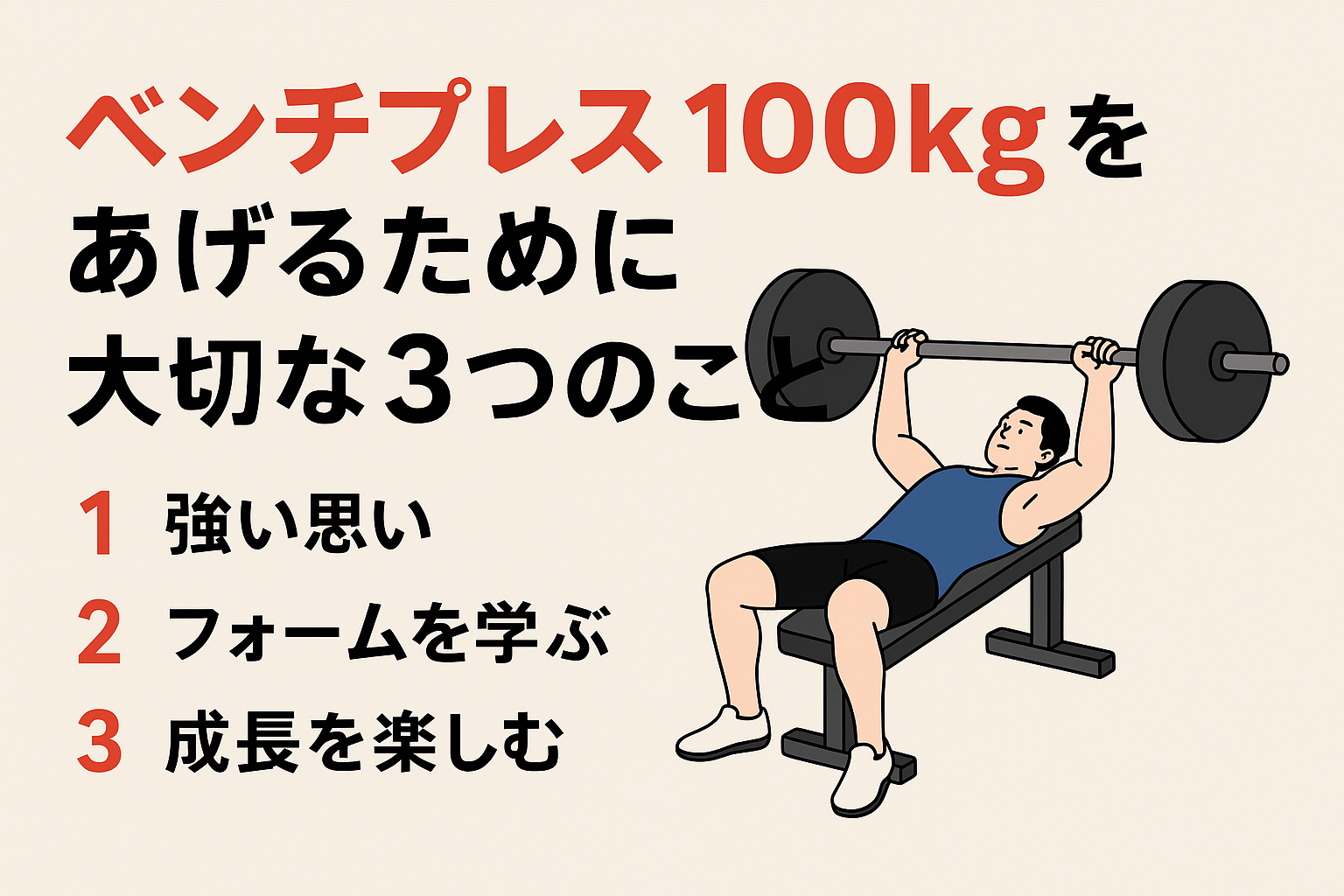 筆者自身も、レッグドライブを意識する前はベンチプレスが85kgで頭打ちしていました。しかし、足の位置を安定させて床を押す感覚を掴んでからは、数週間で90kg、最終的には100kgまで挙上できました。